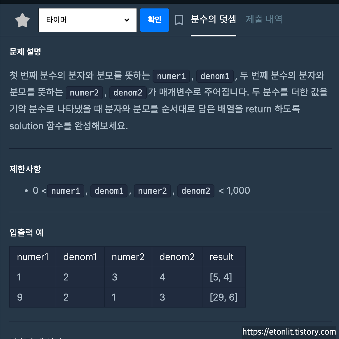 ๋ ๋ถ์์ ํฉ์ ๊ธฐ์ฝ ๋ถ์๋ก ๋ํ๋์ ๋, ๋ถ์์ ๋ถ๋ชจ๋ฅผ ์์๋๋ก ๋ด์ ๋ฐฐ์ด์