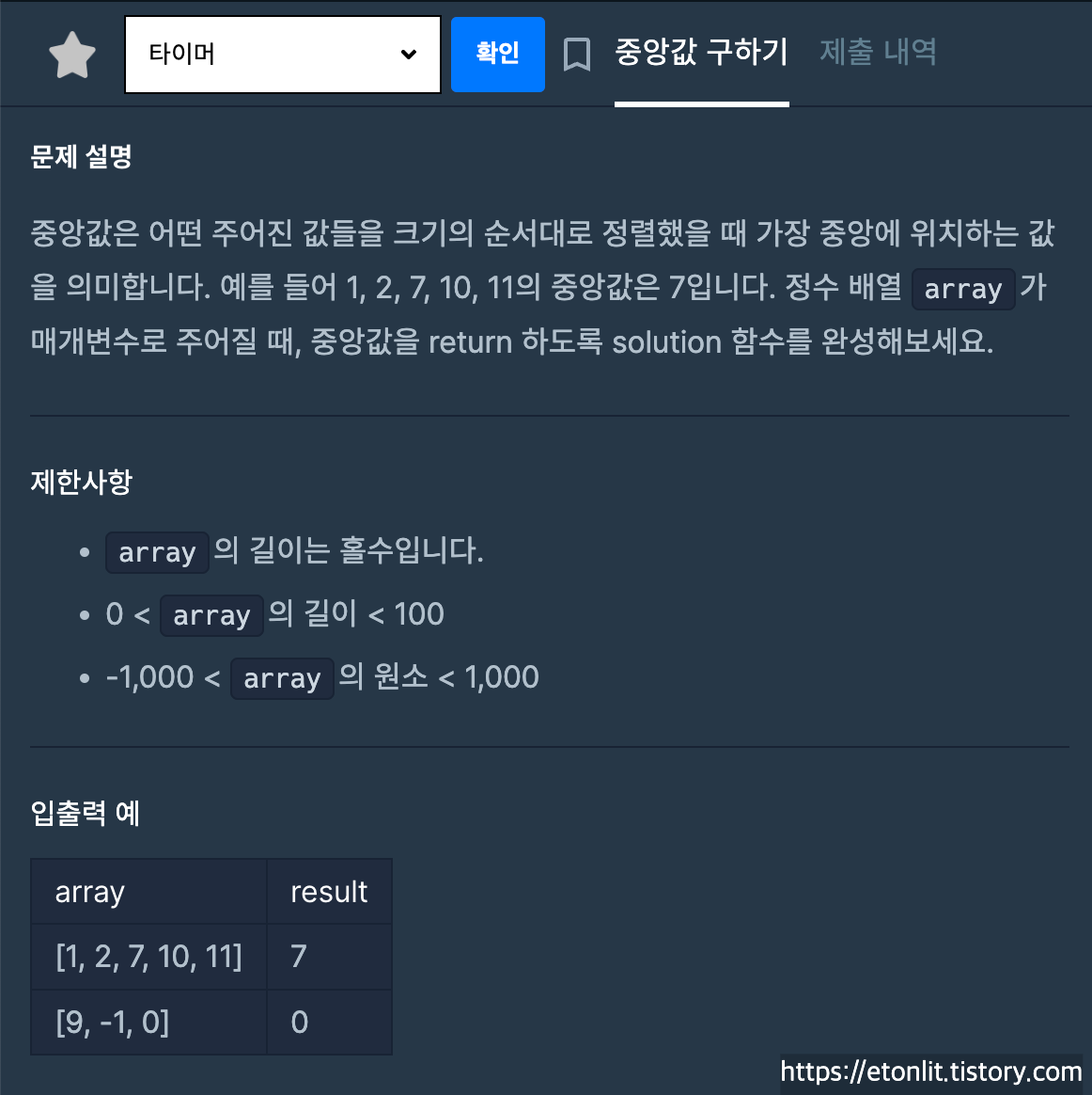 return sorted_data[n//2] # ๋ฐ์ดํฐ ํ์ํ ์ค์๊ฐ ๋ฐํ